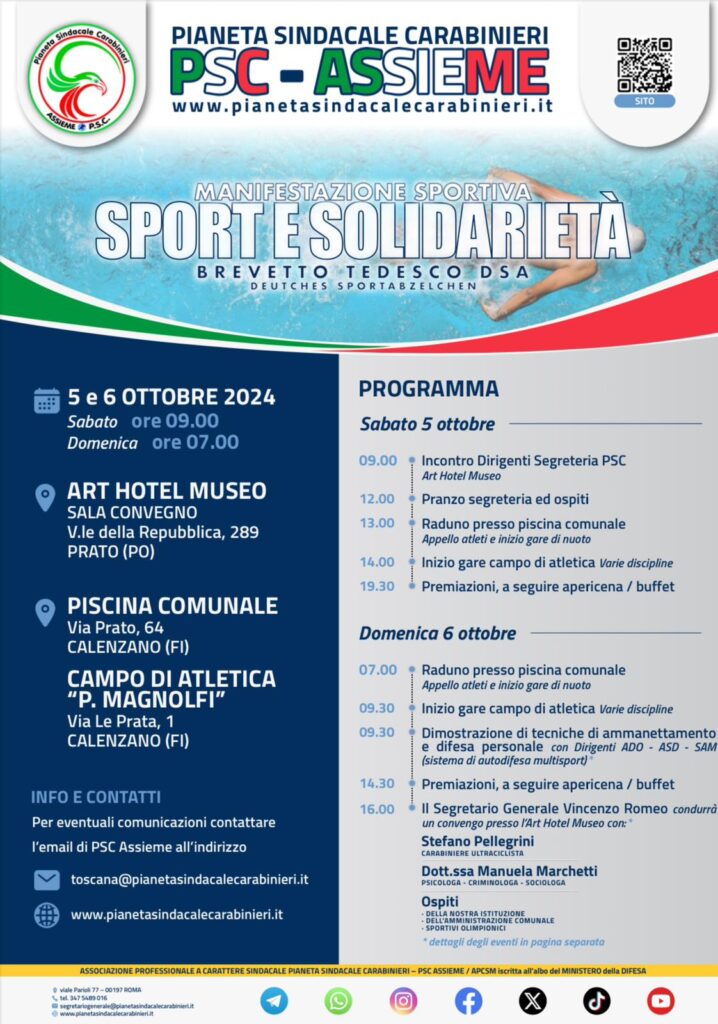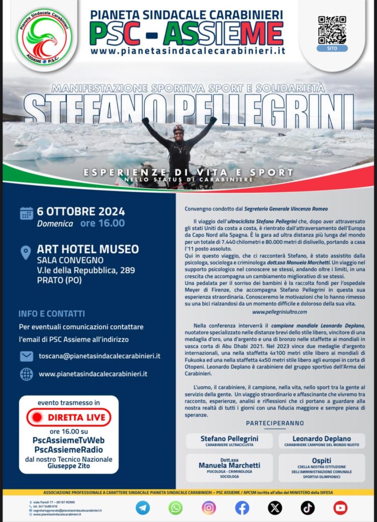 Il 6 Ottobre 2024, nella città di Prato, si è tenuto il Convegno “Esperienze di Vita e Sport nello Status di Carabiniere”, un evento di grande rilevanza che ha visto una partecipazione qualificata e appassionata. L’incontro è stato anche trasmesso in diretta su Radio – Tv PSCAssieme, permettendo a un pubblico più ampio di seguire i temi trattati.
